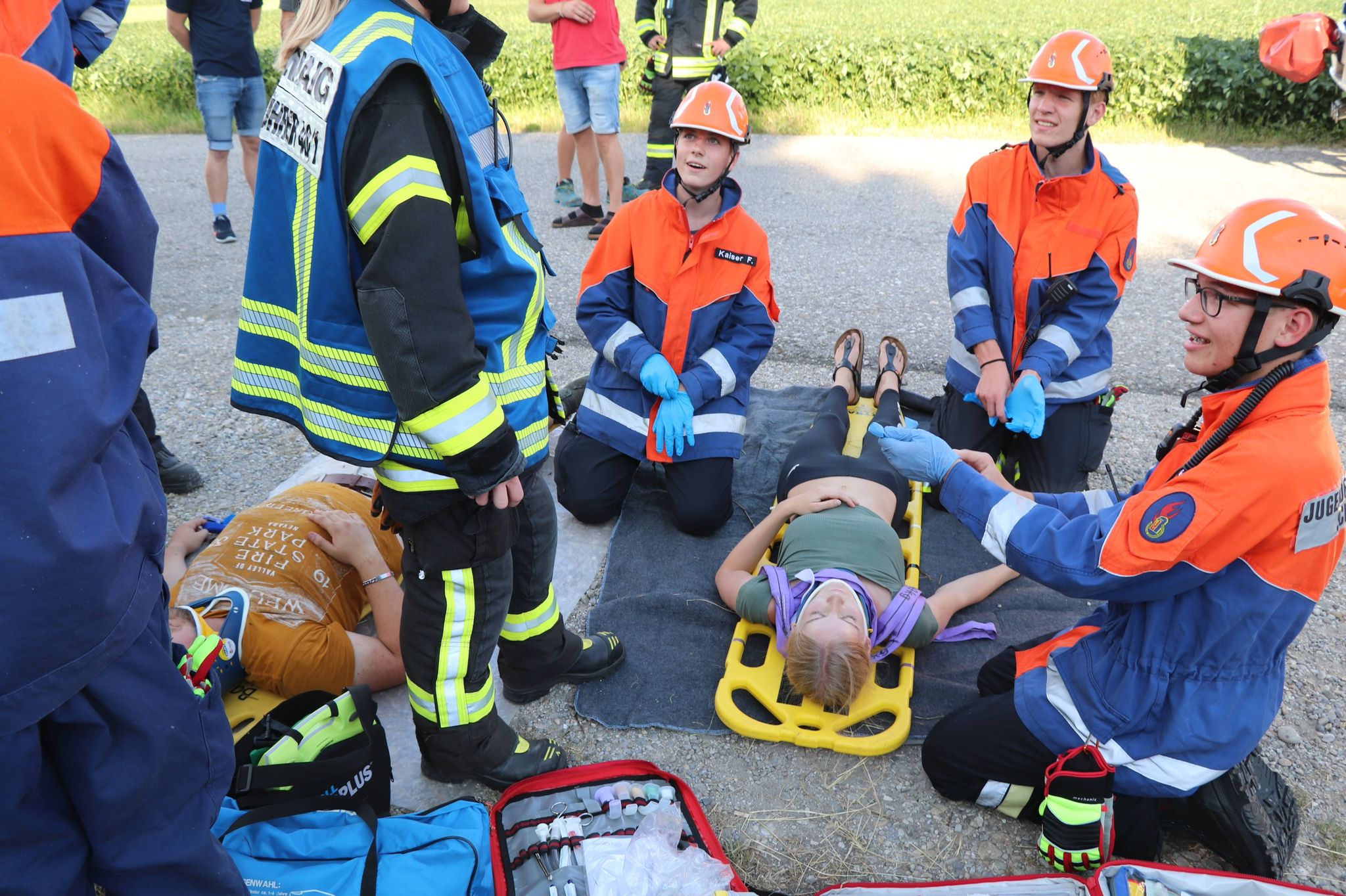 Am Nachmittag stand für die Jugendlichen ein ausführlicher Übungsdienst zum Thema technische Hilfeleistung bei Verkehrsunfällen auf dem Programm. Die Ausbildung umfasste verschiedene Maßnahmen zur Ersten Hilfe, wie z.B. die Betreuung von Patienten oder die Rettung aus einem PKW mit dem Spineboard. An einer weiteren Station erlernten die Nachwuchskräfte den sicheren Umgang mit dem Hebekissensatz, um Lasten anzuheben. Die letzte Station beinhaltete die Vorbereitung der Bereitstellungsplane mit allen Werkzeugen, die für die Personenrettung aus Unfallfahrzeugen nötig sind.