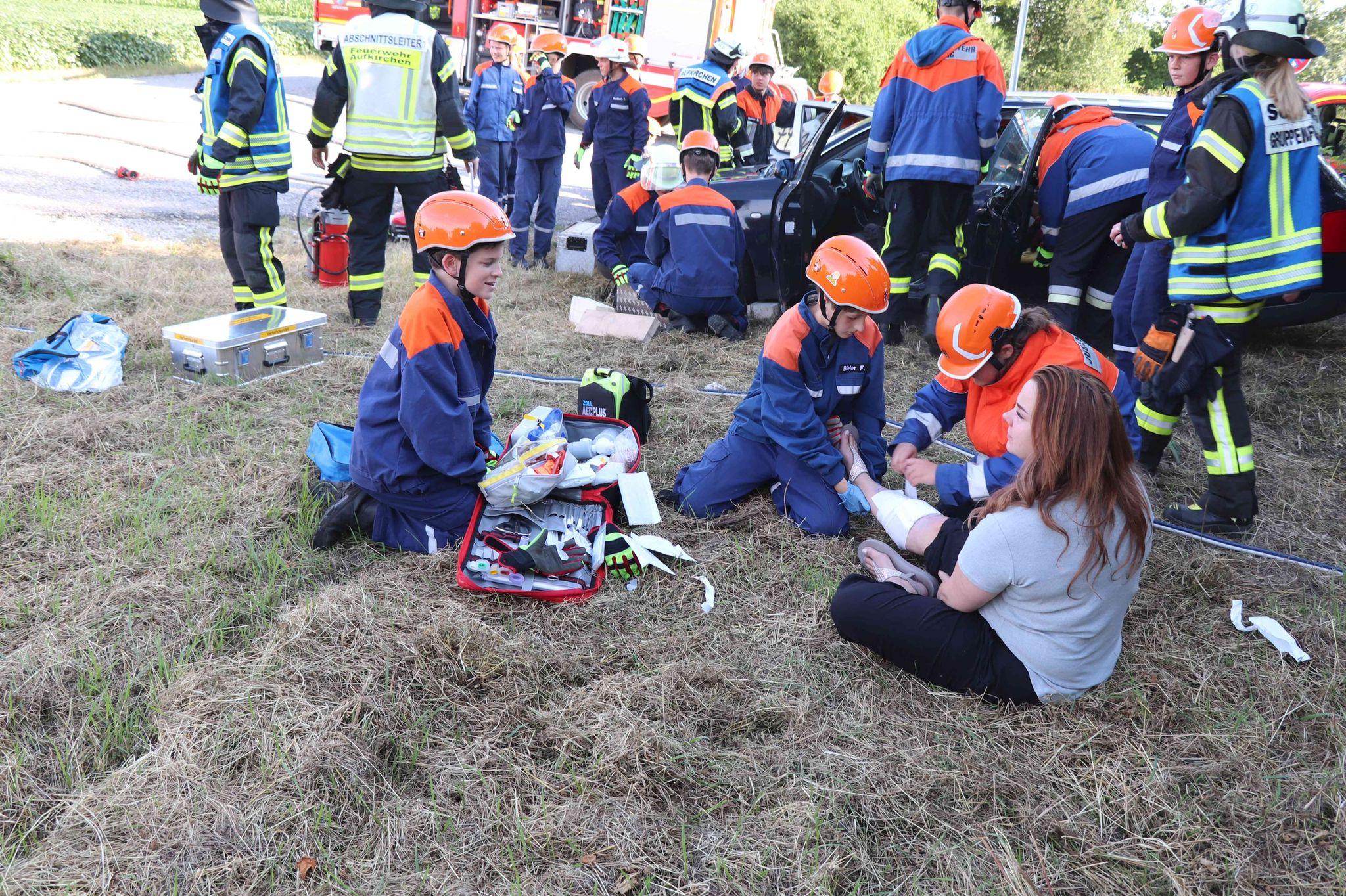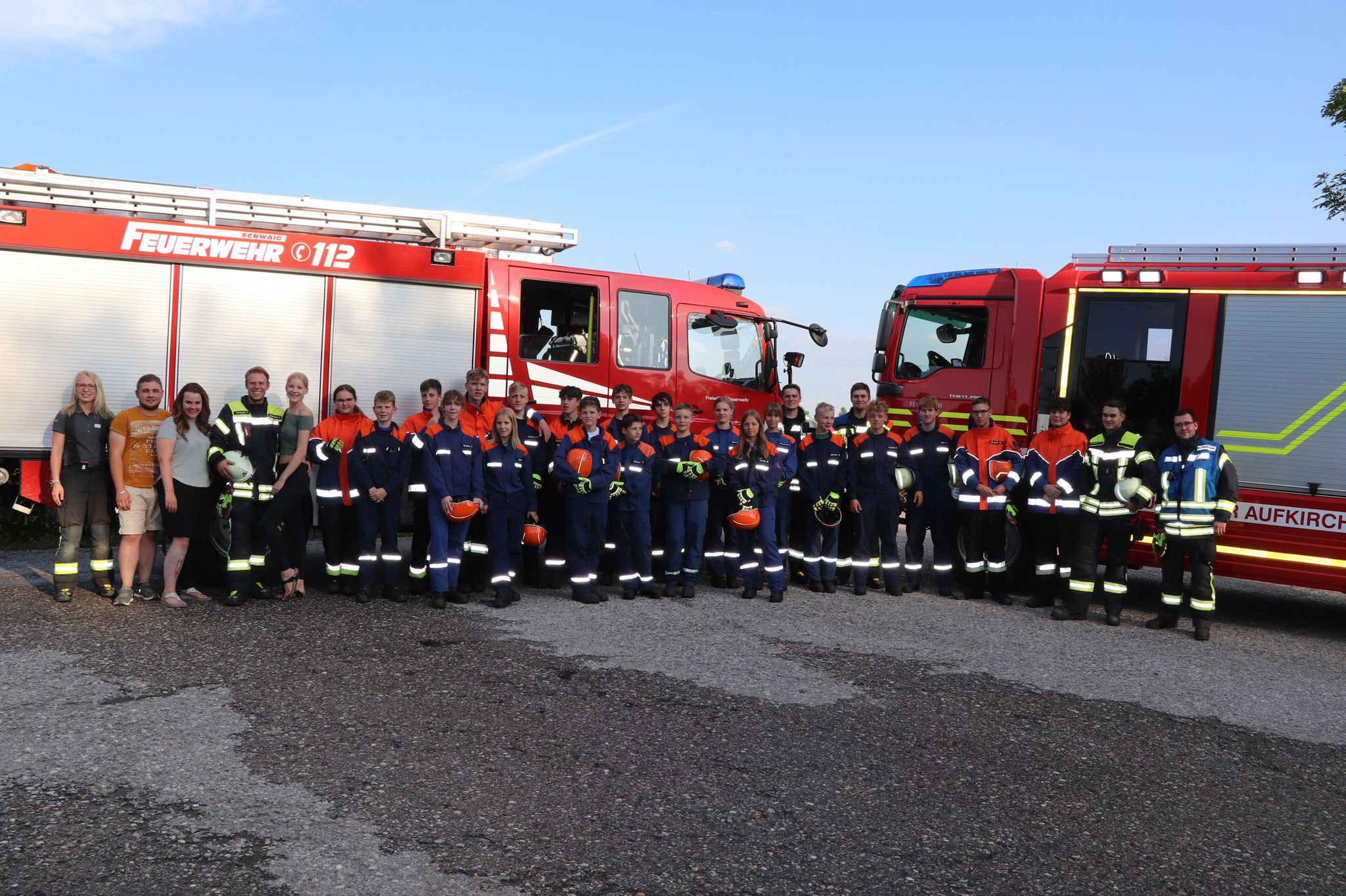 Gegen 18.00 Uhr war der erste Alarm für die Kräfte aus Aufkirchen. Gemeldet war ein schwerer Verkehrsunfall in Schwaig im Gewerbegebiet. Alarmiert waren die Jugendfeuerwehr aus Aufkirchen und Schwaig. Ein PKW hatte einen Fußgänger erfasst und ist anschließend mit einem weiteren PKW kollidiert. Durch den Zusammenstoß fing ein Wagen Feuer, so dass die Brandbekämpfung im ersten Moment höchste Priorität hatte. Im weiteren Verlauf wurden die Verletzten von den Jugendlichen betreut und versorgt. Um zu verhindern, dass sich die Fahrzeuge ungewollt bewegen, wurden sie unterbaut und gegen Wegrollen gesichert. Der Patient unter dem Fahrzeug musste aufwendig mit dem Hebekissensatz befreit werden. Erschwerend kam hinzu, dass sehr wenig Platz war, um zu den Patienten zu gelangen. Die Rettungskräfte mussten hier sehr eng zusammenarbeiten, um sich nicht gegenseitig zu behindern. Nachdem alle Personen befreit waren, stellten sich die Teilnehmer noch an der Einsatzstelle zum gemeinsamen Gruppenfoto auf.