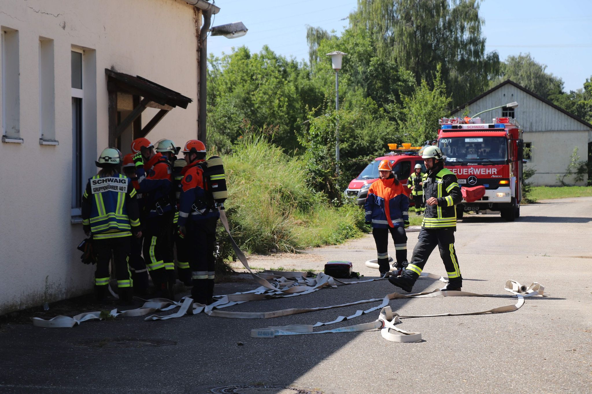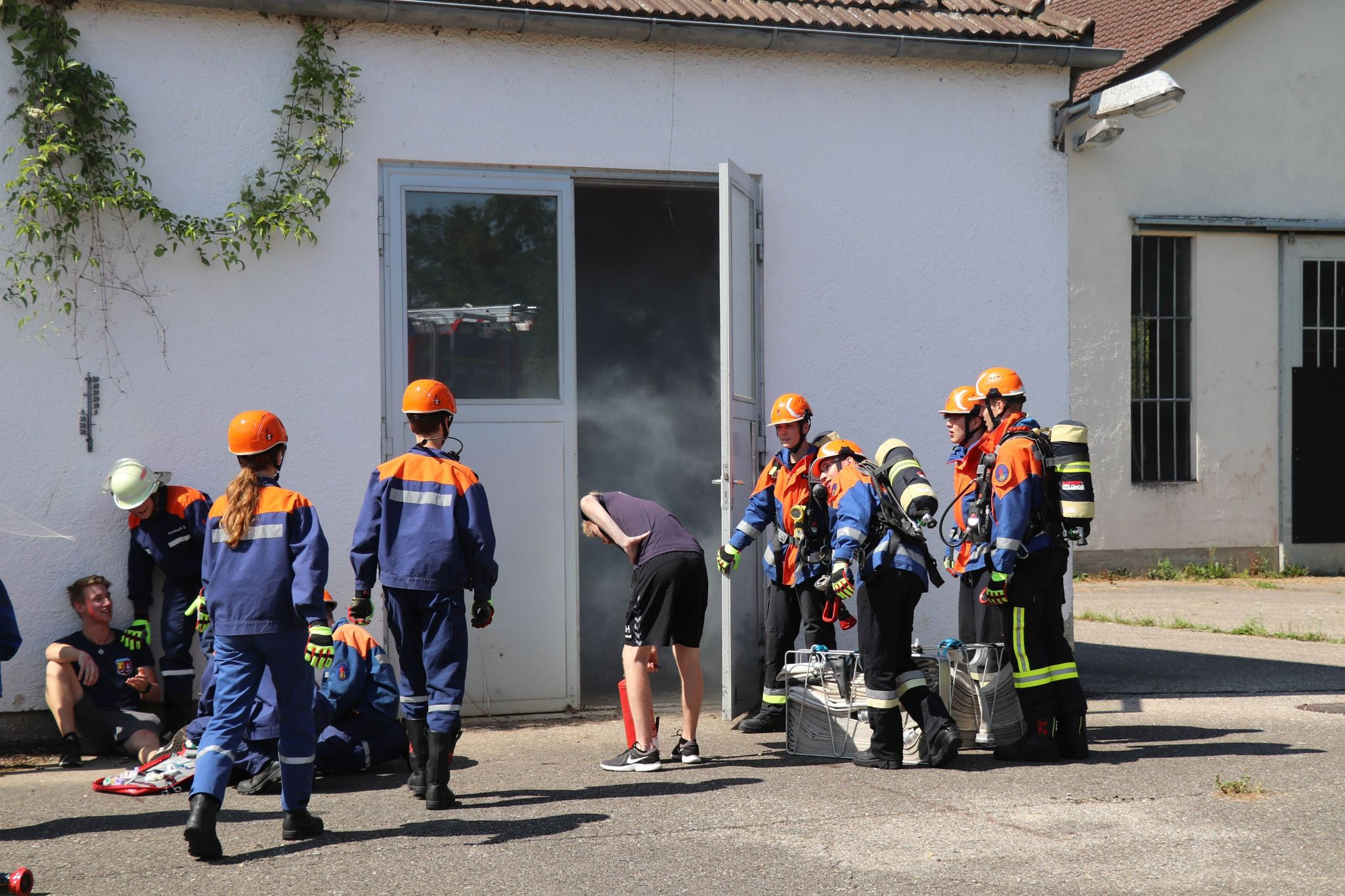 Während in Aufkirchen geübt wurde, startete die Schwaiger Gruppe bereits mit einem Garagenbrand mit vermisster Person. Hier stellten die Jugendlichen Ihr gelerntes Wissen im Bereich Brandbekämpfung unter Beweis und konnten die Person retten und den Brand löschen.